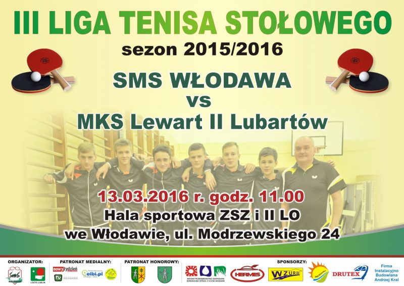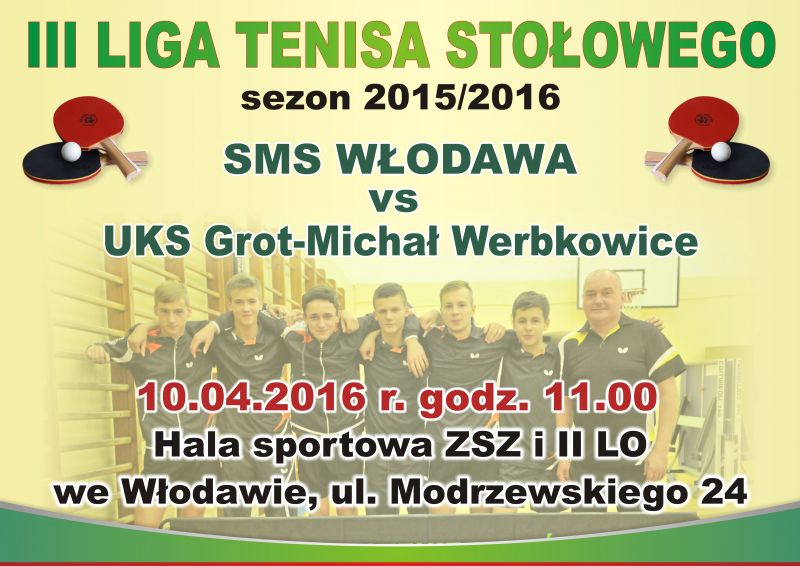 W dniu rozegranym 10.04.2016 r. we Włodawie meczu III ligi tenisa stołowego zawodnicy SMS Włodawa pokonali pewnie 8:2 zespół UKS Grot-Michał Werbkowice i na jedną kolejkę przed końcem rozgrywek zapewnili sobie awans do 2 ligi.