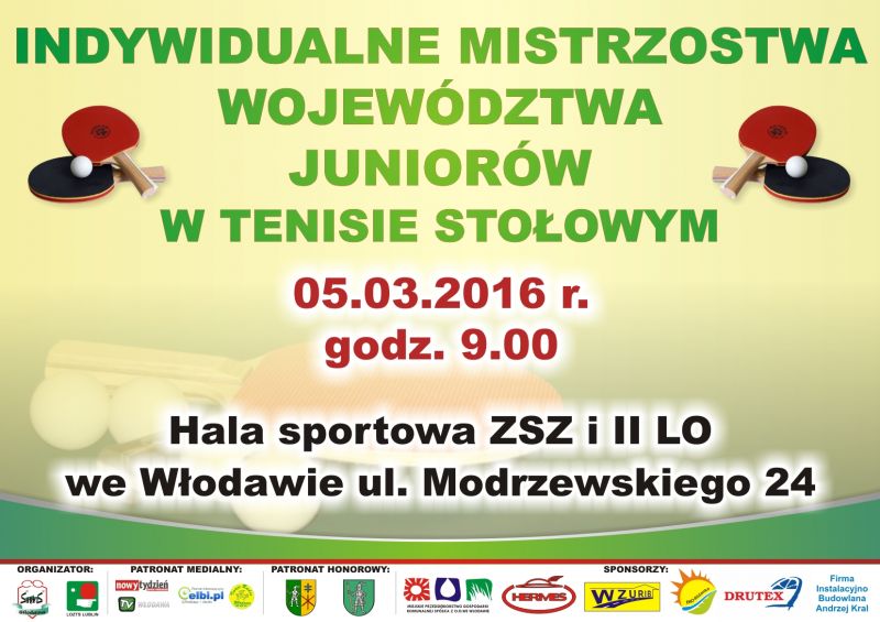 W dniu 05.03..2016 r. rozegrane zostaną we Włodawie Indywidualne Mistrzostwa Województwa w tenisie stołowym w kategorii Juniorów i Juniorek.